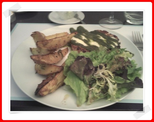 Eu pedi um hamburguer de frango pestorella com pesto e queijo mozzarella, acompanhado de salada e batatas assadas em alecrim! Uma maravilha! A acompanhar uma sangria rosé e de sobremesa, tarte de leite condensado.